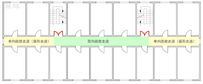 根据安全出口的数量及房间疏散门的相对位置,疏散走道的疏散形式可分为双向疏散走道和单向疏散走道【图示1】。
