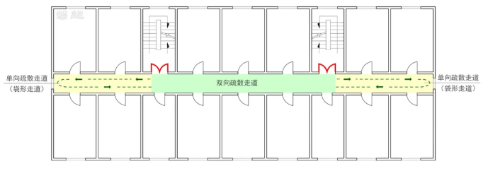 根据安全出口的数量及房间疏散门的相对位置,疏散走道的疏散形式可分为双向疏散走道和单向疏散走道。