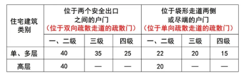 (2)表5.5.17和表5.5.29所述的 “位于袋形走道两侧或尽端的疏散门(户门)”,统一对应为“位于单向疏散走道的疏散门(户门)”。