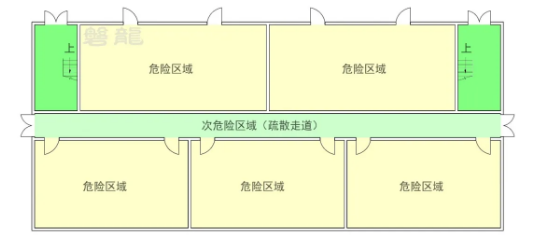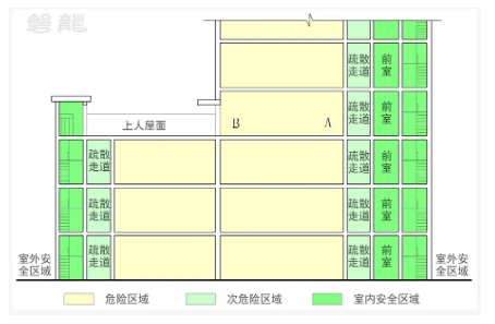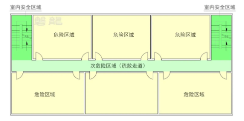 疏散走道是疏散通道的一部分,通常指从房间疏散门至安全出口之间的路径。疏散走道属于次危险区域【图示3】,其基本要求如下: