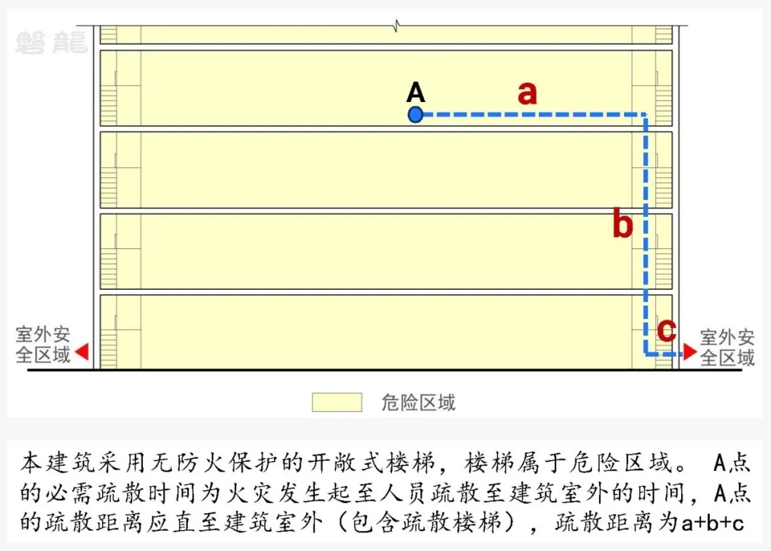 示例:在【图示3】建筑中,采用无防火保护的开敞式楼梯,楼梯属于危险区域,需要以建筑室外作为疏散时间的控制目标。必需疏散时间为火灾发生起至人员疏散至建筑室外的时间,包括竖向疏散楼梯的疏散时间。室内任意一点的疏散距离计算,均应延伸至建筑室外,本图示中,A点的疏散距离为a+b+c。该建筑大部分区域的必需疏散时间均大于可用疏散时间,人员安全无法保证。