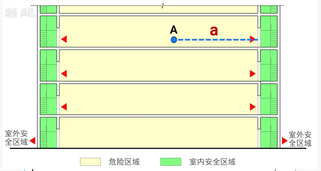 (2)以室内安全区域作为必需疏散时间的控制目标。室内任意点至建筑室外的疏散距离,优化为至疏散楼梯间的疏散距离。以【图示3】为例,将疏散楼梯间构建为室内安全区域后,原A点处的疏散距离,由a+b+c转化为a,参见【图示7】。