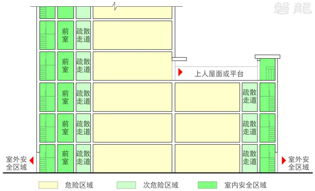 (1)设置室内安全区域和次危险区域,作为疏散过程中的过渡与缓冲空间;