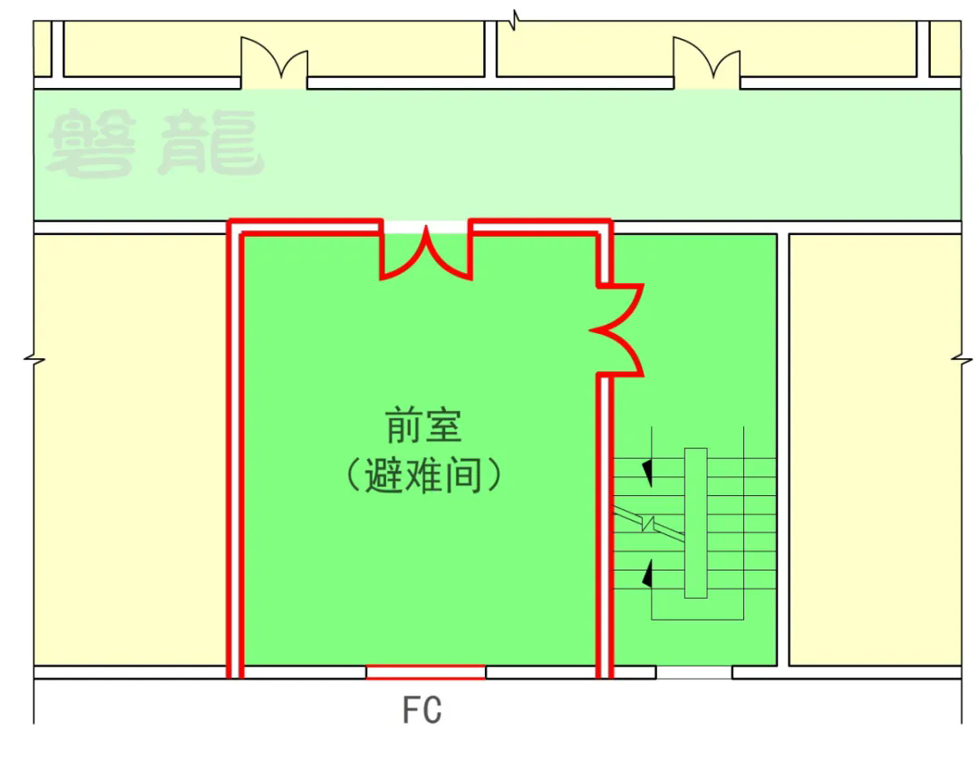 将疏散楼梯间和前室构建为室内安全区域【图示5】【图示6】,豁免室内安全区域的疏散时间和疏散距离,是解决安全疏散时间的基本手段。
