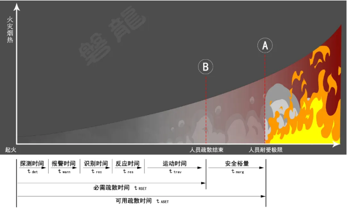 假设A点为火势发展至危及人员安全的临界时刻,则全部人员必须在A点之前完成疏散;假设B点为人员实际疏散完成的时刻,则B点必须早于A点。